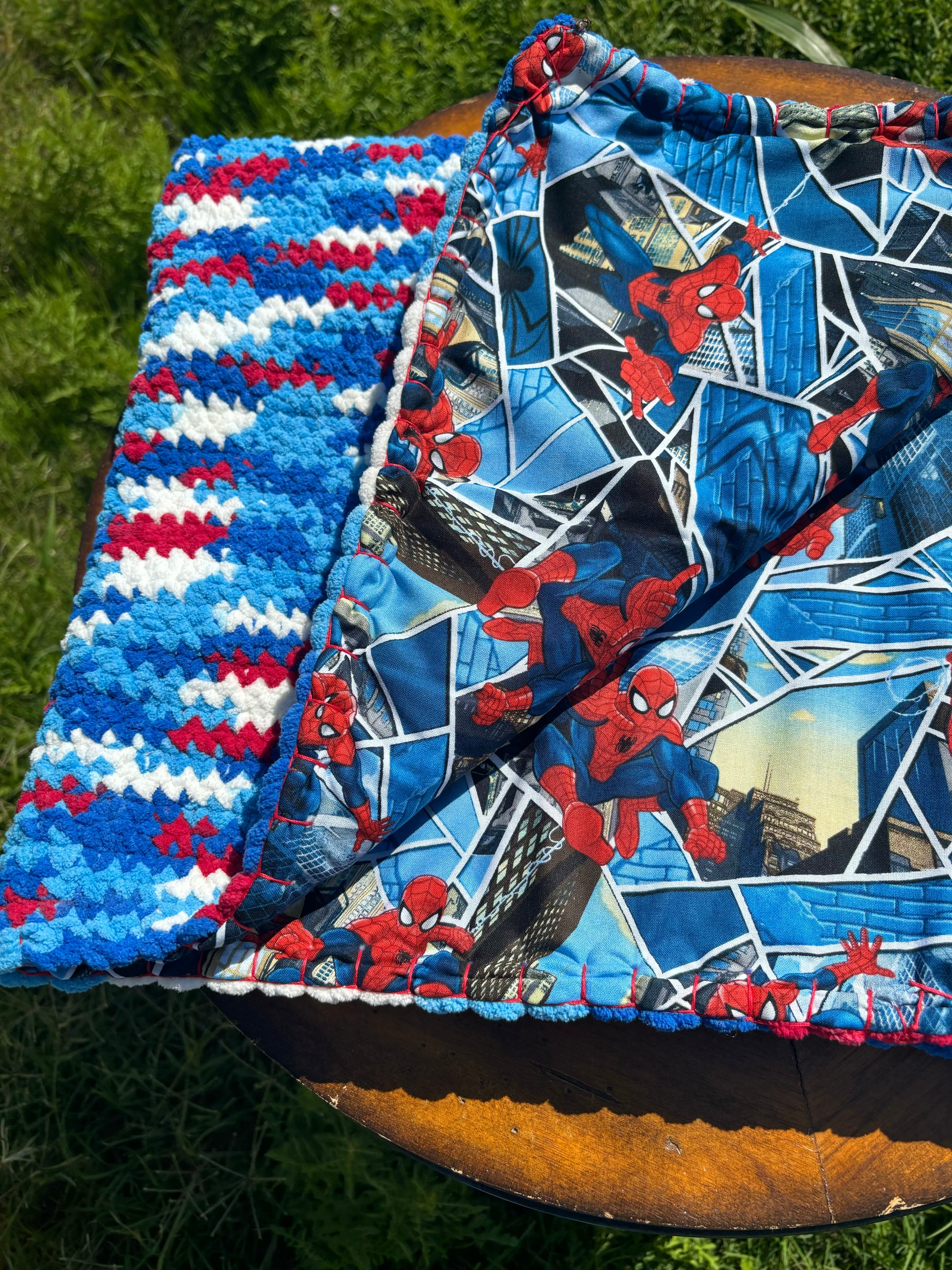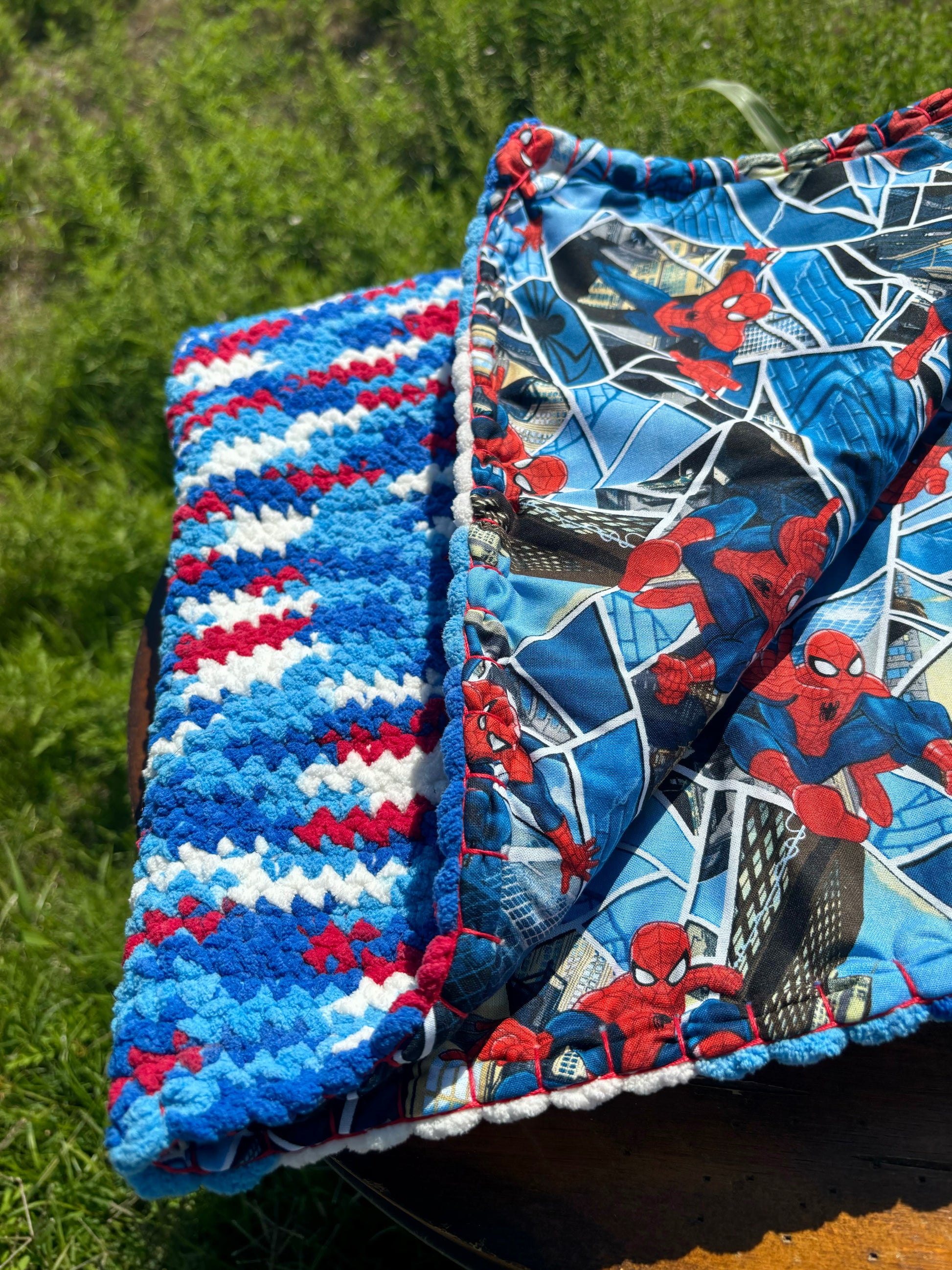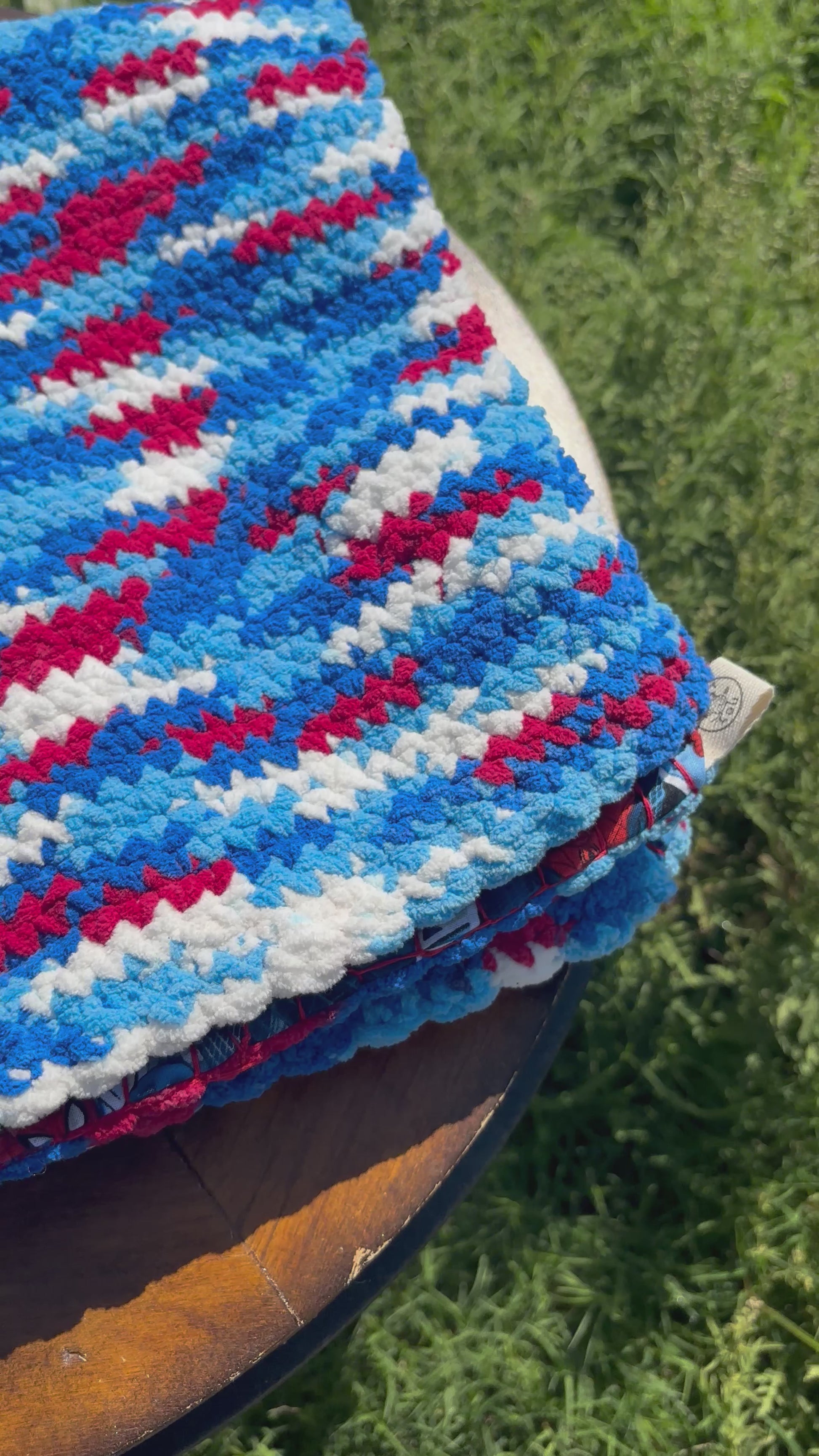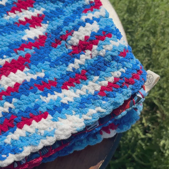 KnitToMyLou's Adventurer Reversible Baby Blanket is a two-sided handmade blanket. One side is a handmade crochet piece and the other side is cotton fabric. The fabric backing is 100% cotton and is attached with hand-sewn stitches that cover the perimeter of the blanket. Use the yarn side to keep your baby nice and warm, or use the cotton side for comfort and coolness.