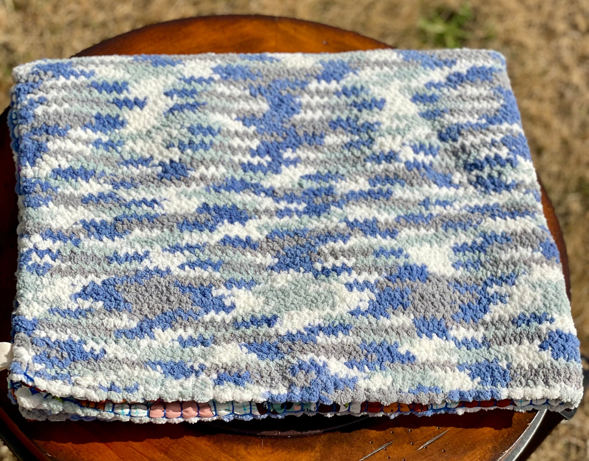 KnitToMyLou's Animal ABCs Reversible Baby Blanket is a two-sided handmade blanket. One side is a crochet piece and the other side is cotton fabric. The fabric backing is 100% cotton and is attached with hand-sewn stitches that cover the perimeter of the blanket. Use the yarn side to keep your baby nice and warm, or use the cotton side for comfort and coolness.