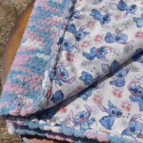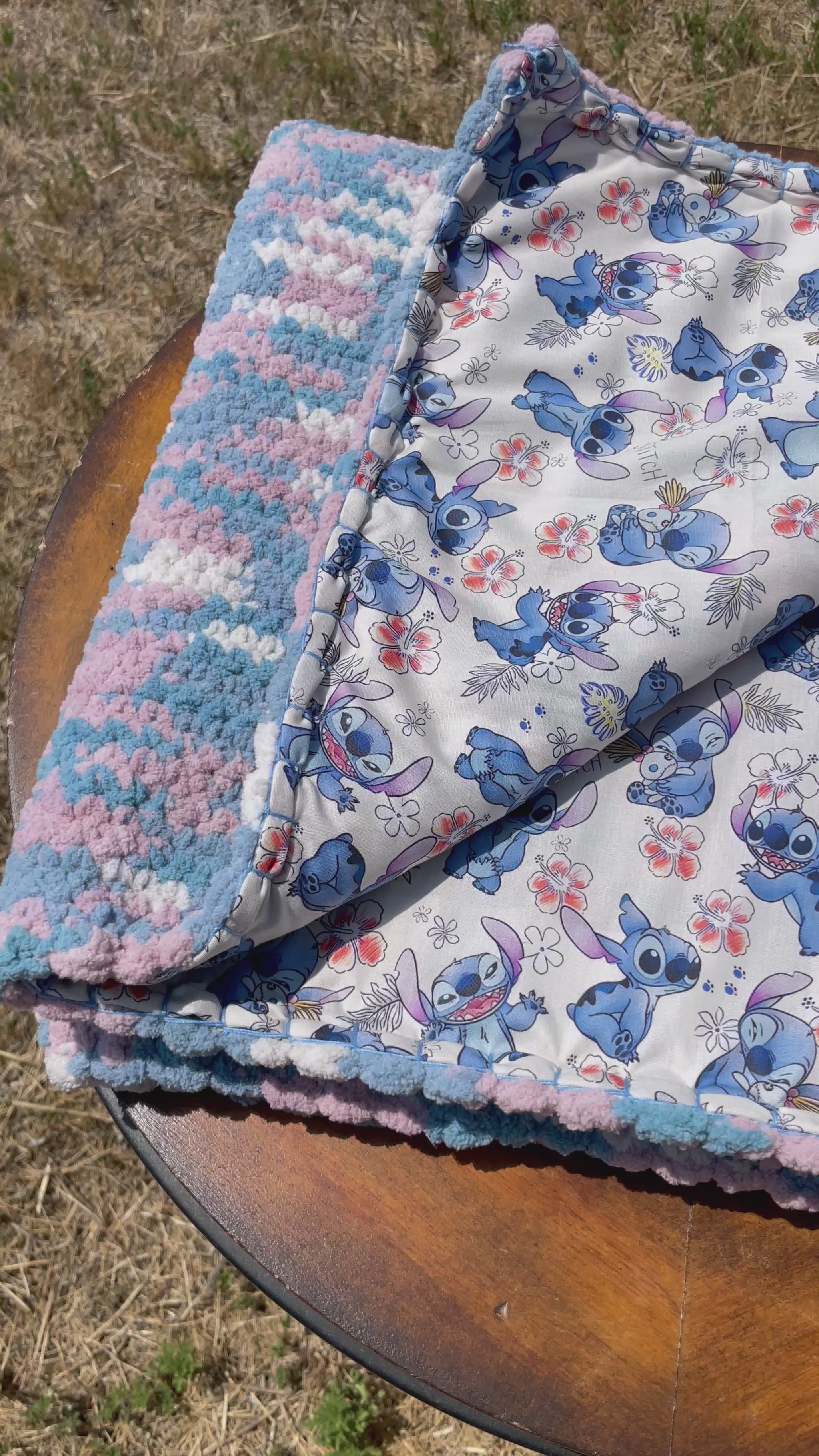 KnitToMyLou's Cool Breeze Reversible Baby Blanket is a two-sided handmade blanket. One side is a crochet piece and the other side is cotton fabric. The fabric backing is 100% cotton and is attached with hand-sewn stitches that cover the perimeter of the blanket. Use the yarn side to keep your baby nice and warm, or use the cotton side for comfort and coolness.