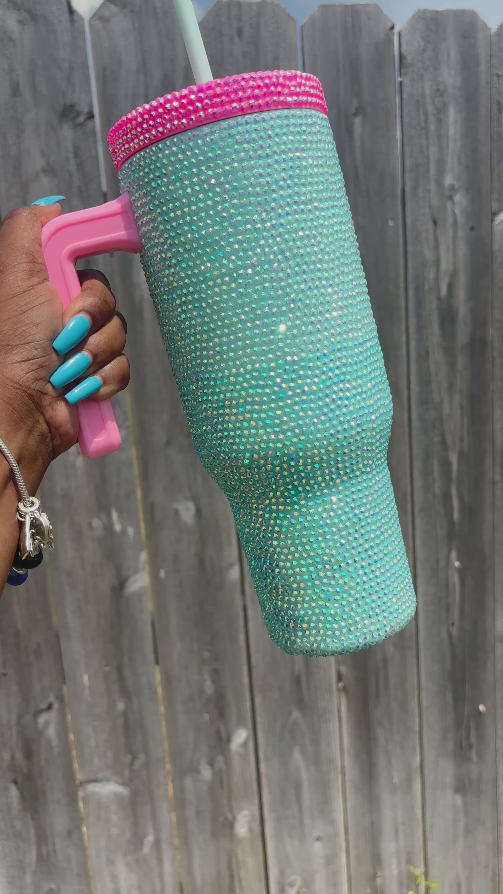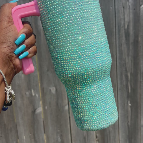 Lou’s Luxe Aquamarine Cup was handmade with love by placing each individual rhinestone by hand.