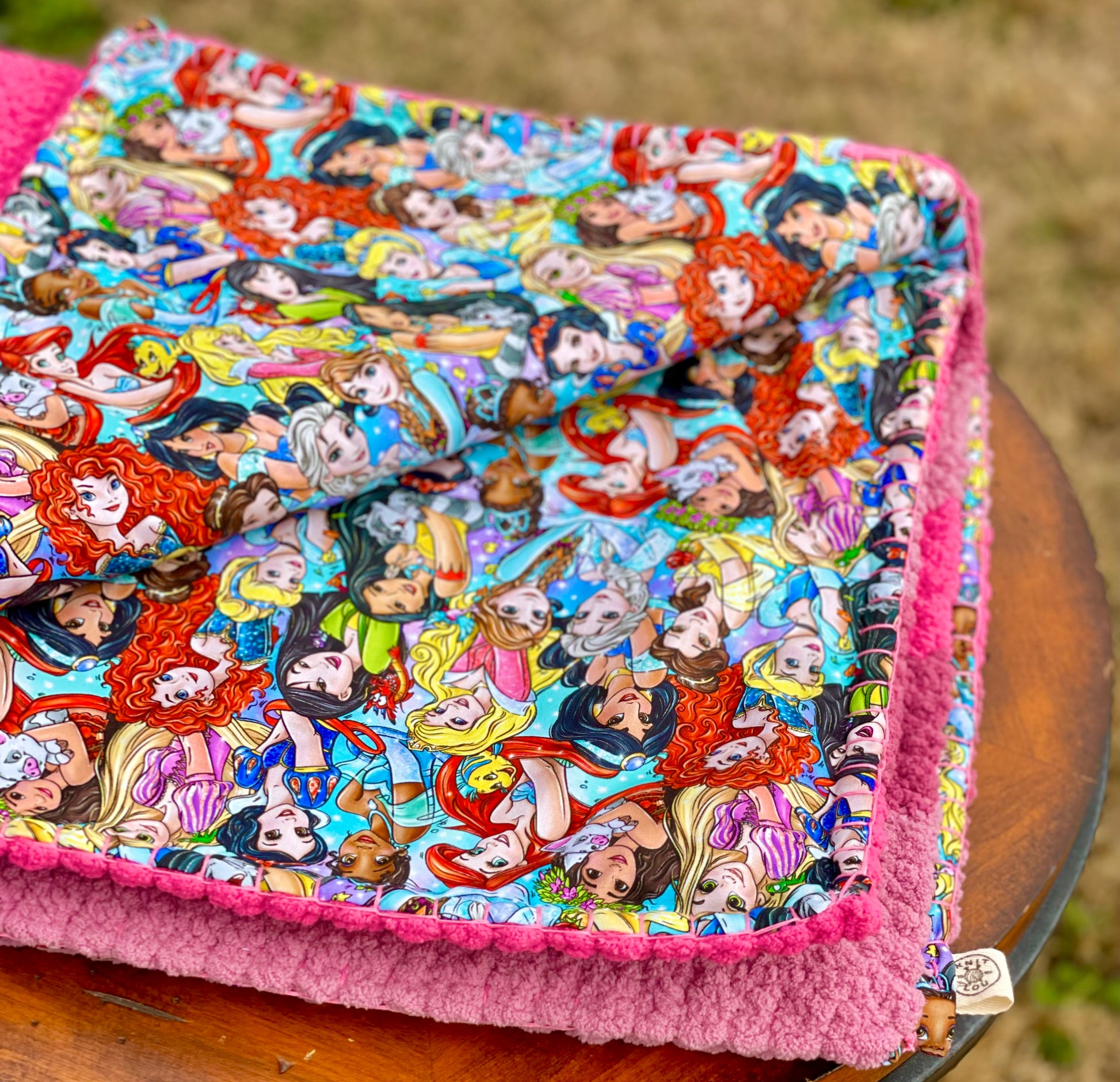 KnitToMyLou's Princess Party Reversible Baby Blanket is a two-sided handmade blanket. One side is a crochet piece and the other side is cotton fabric. The fabric backing is 100% cotton and is attached with hand-sewn stitches that cover the perimeter of the blanket. Use the yarn side to keep your baby nice and warm, or use the cotton side for comfort and coolness.