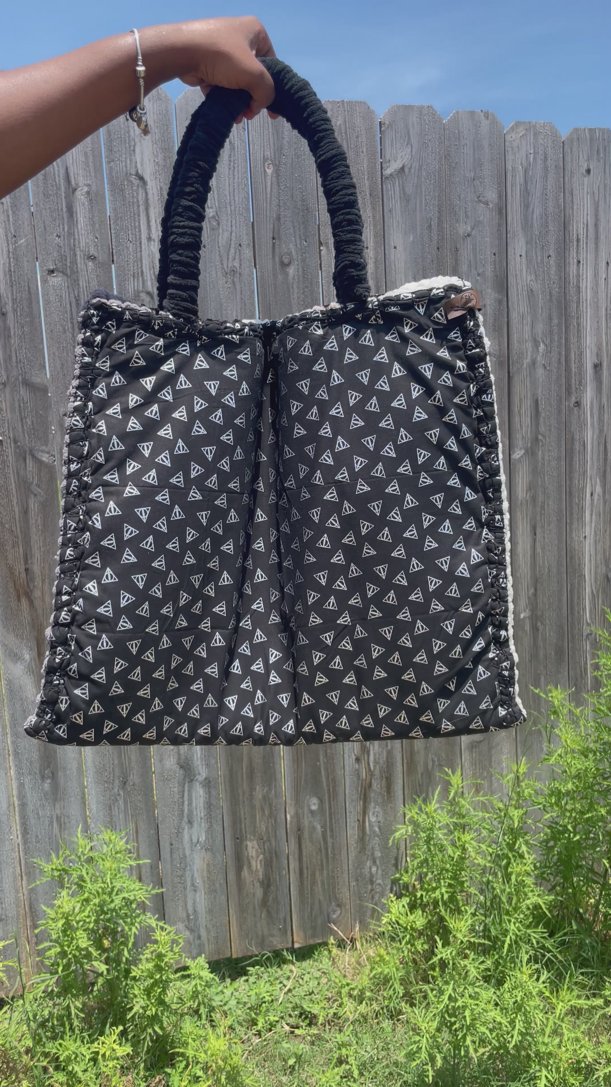 Handmade with love. Crotchet on the inside, fabric on the outside. Both handles sewn on by hand. Very sturdy bag that can hold up to 5 pounds. Large size of bag great for carrying sketch books or large laptops.