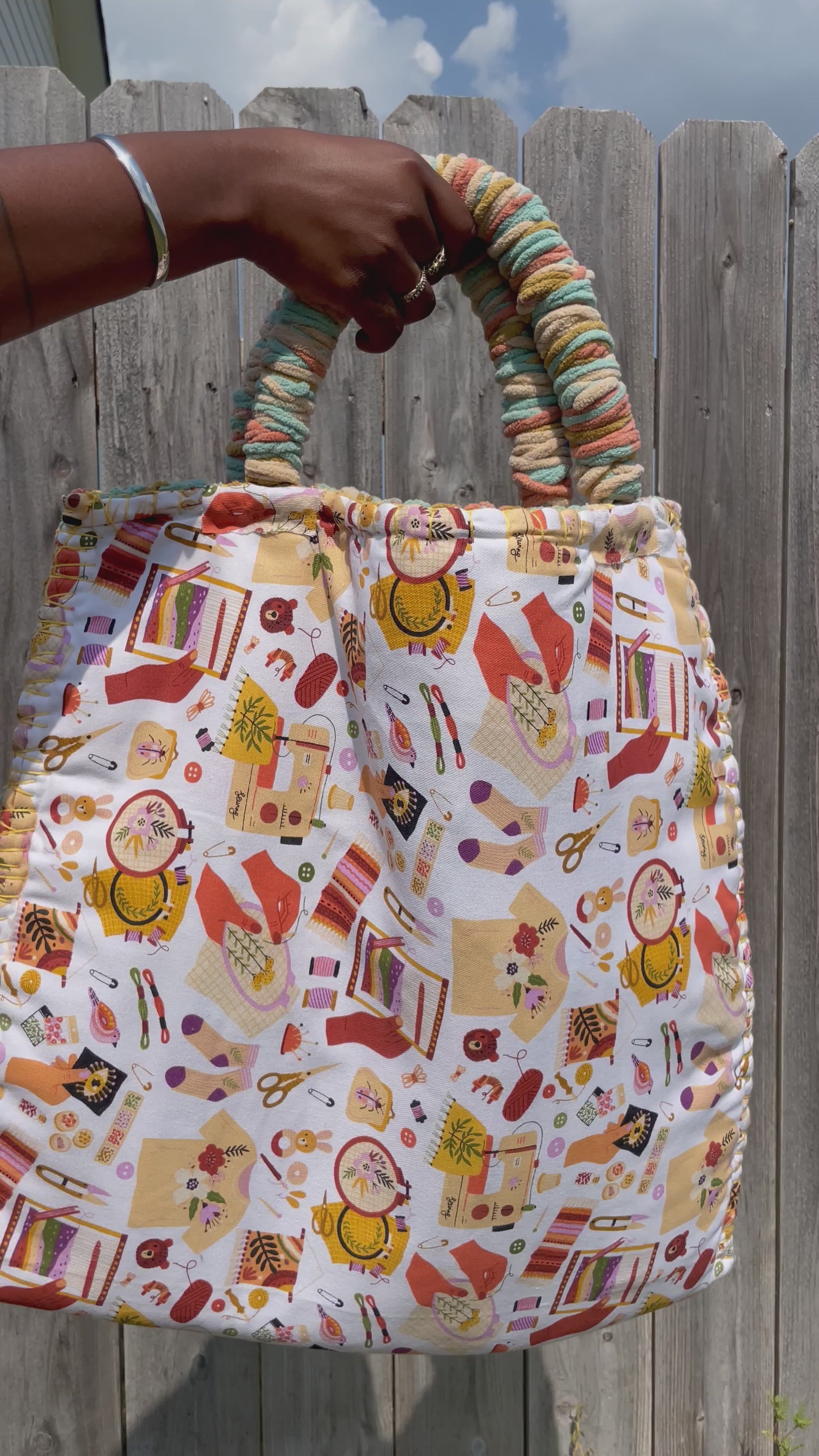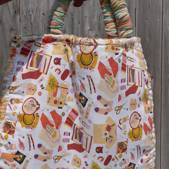 Handmade with love. Crotchet on the inside, fabric on the outside. Both handles sewn on by hand. Very sturdy bag that can hold up to 5 pounds. Large size of bag great for carrying sketch books or large laptops.
