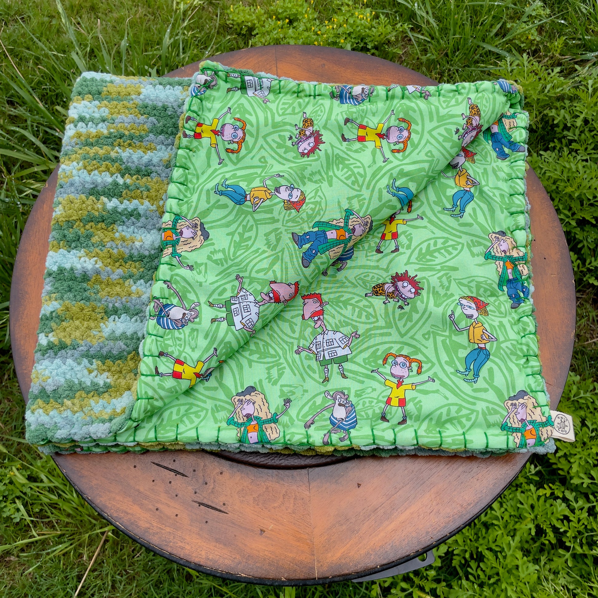 KnitToMyLou's Wild Ones Reversible Baby Blanket is a two-sided handmade blanket. One side is a crochet piece and the other side is cotton fabric. The fabric backing is 100% cotton and is attached with hand-sewn stitches that cover the perimeter of the blanket. Use the yarn side to keep your baby nice and warm, or use the cotton side for comfort and coolness.