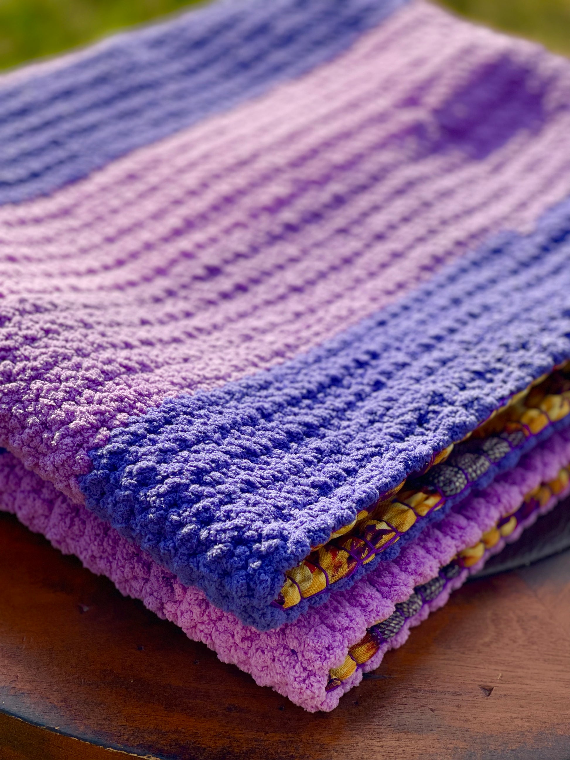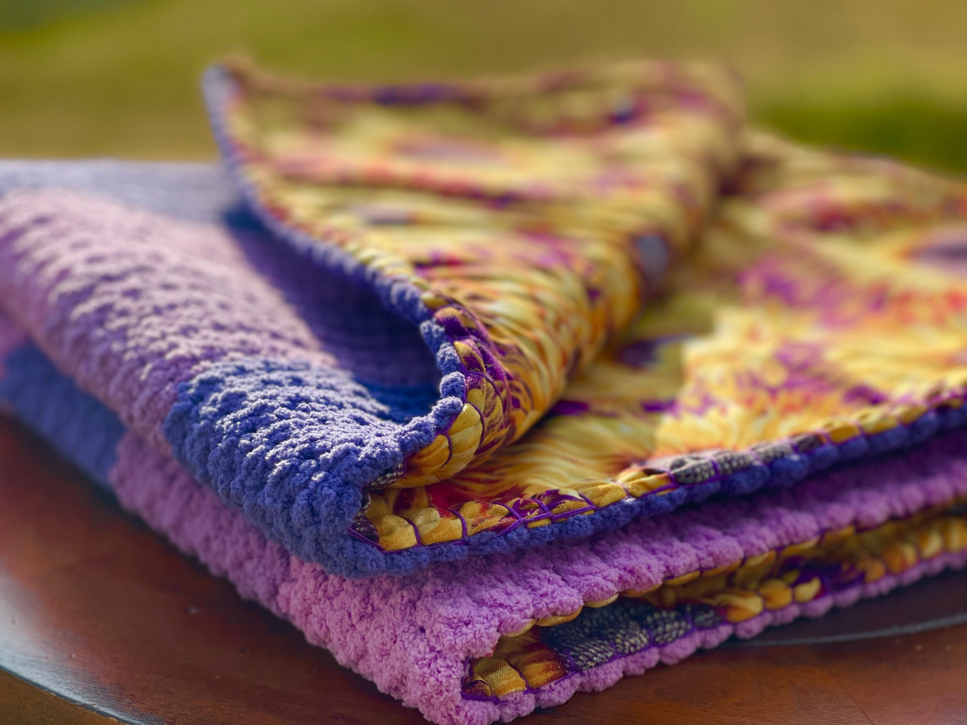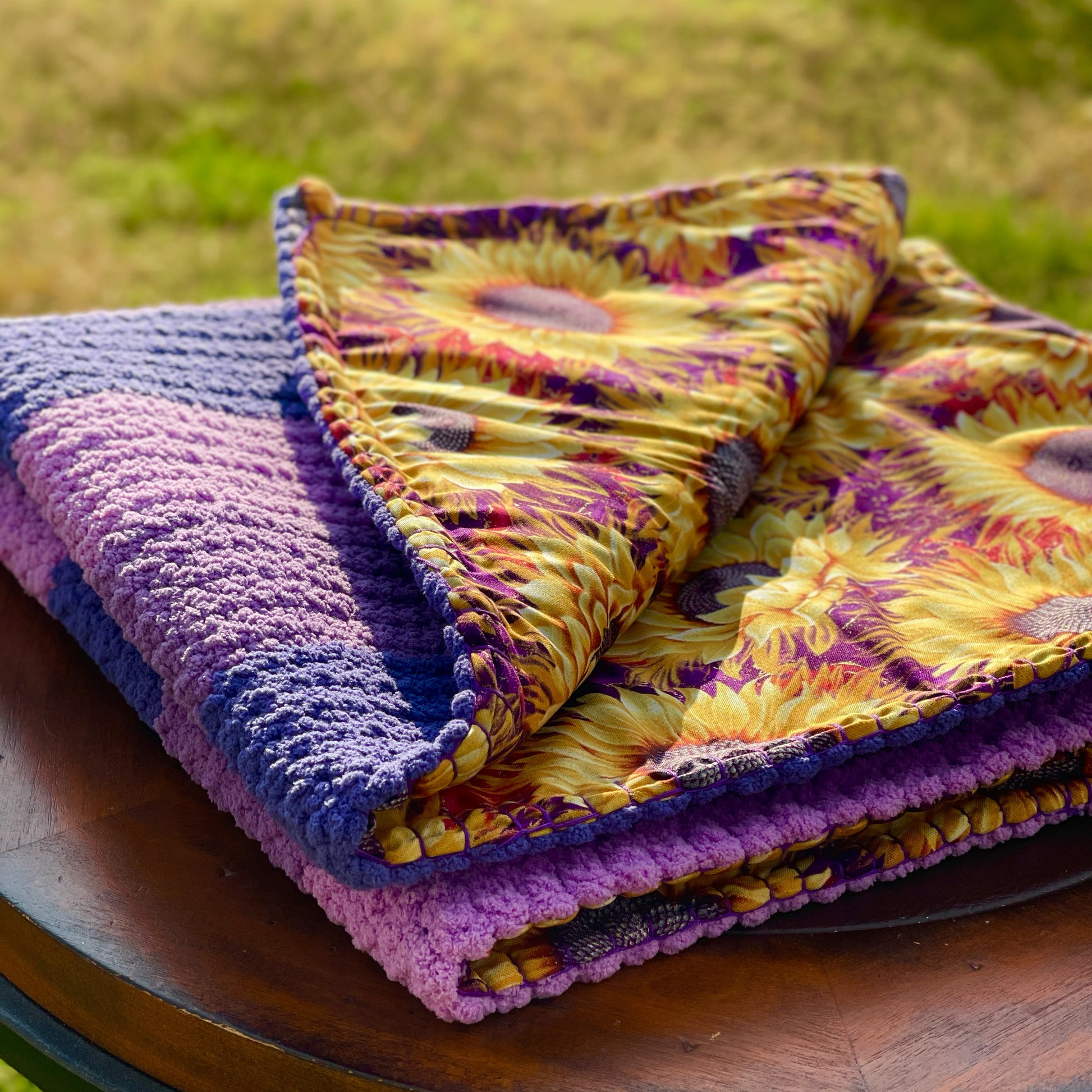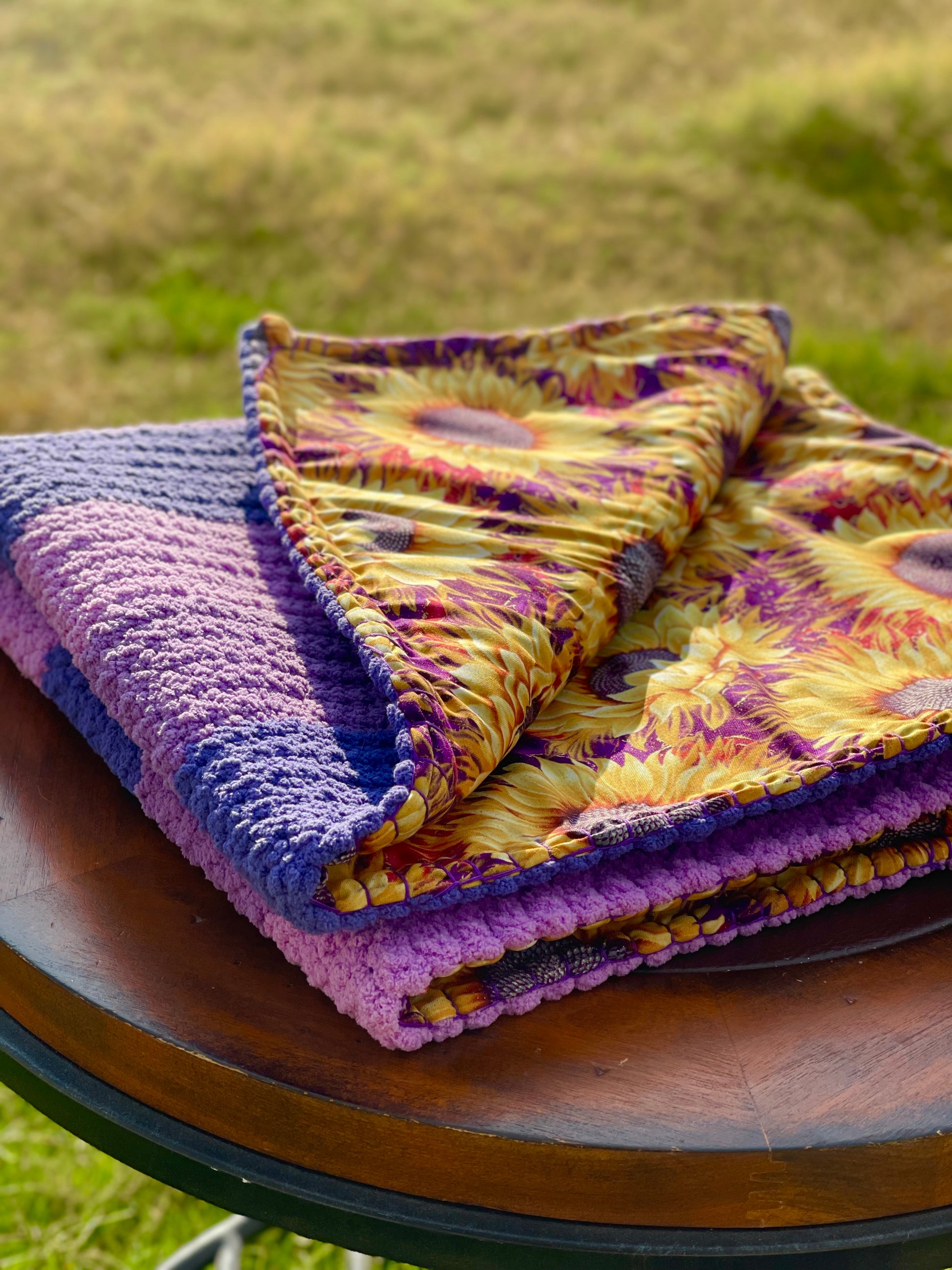 KnitToMyLou's My Sunflower Reversible Baby Blanket is a two-sided handmade blanket. One side is a crochet piece and the other side is cotton fabric. The fabric backing is 100% cotton and is attached with hand-sewn stitches that cover the perimeter of the blanket. Use the yarn side to keep your baby nice and warm, or use the cotton side for comfort and coolness.